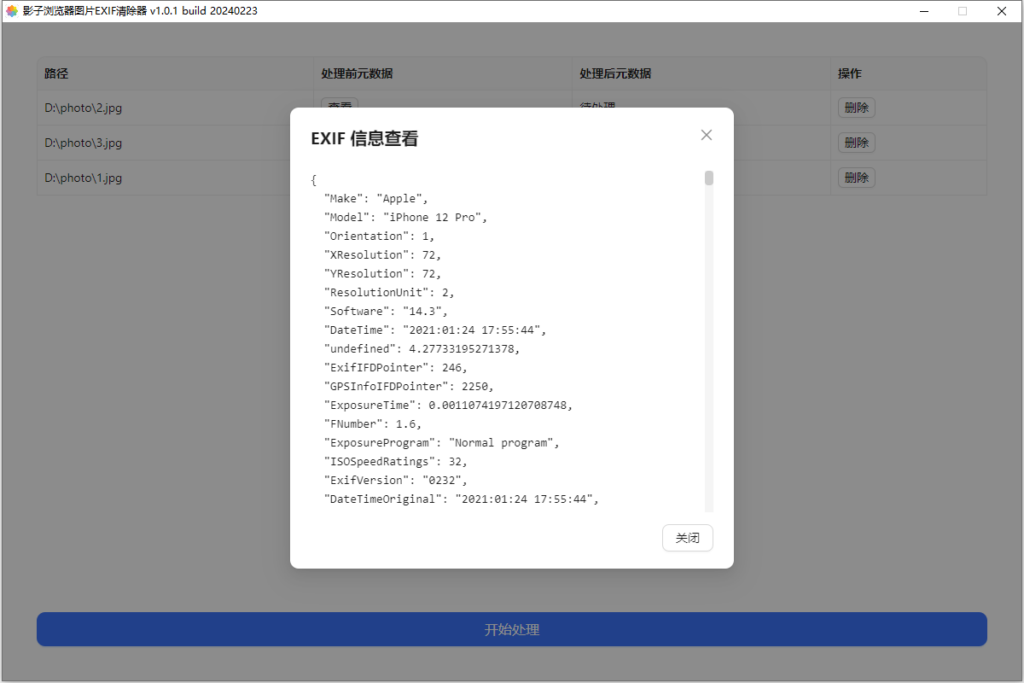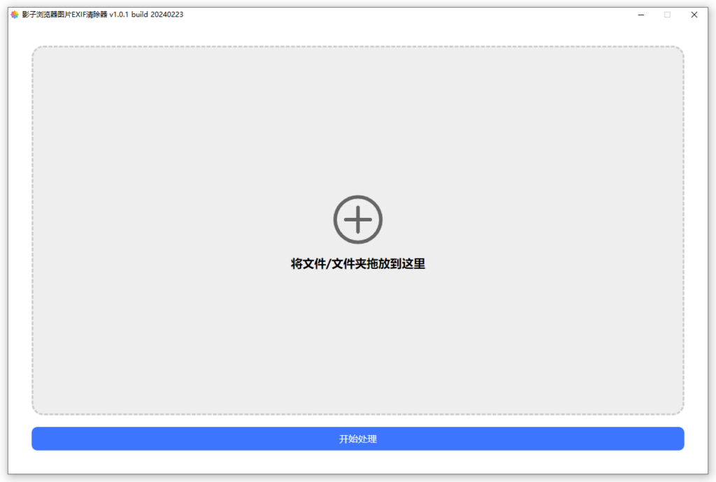 將文件目錄,或者文件拖進(jìn)軟件,點(diǎn)擊”開始處理“,并選擇一個(gè)輸出目錄,即可批量對圖片EXIF信息進(jìn)行清除操作。